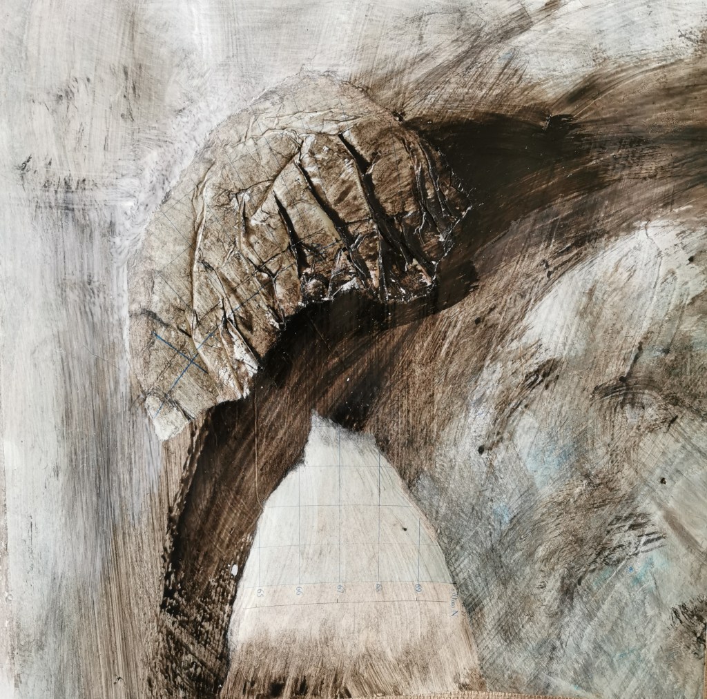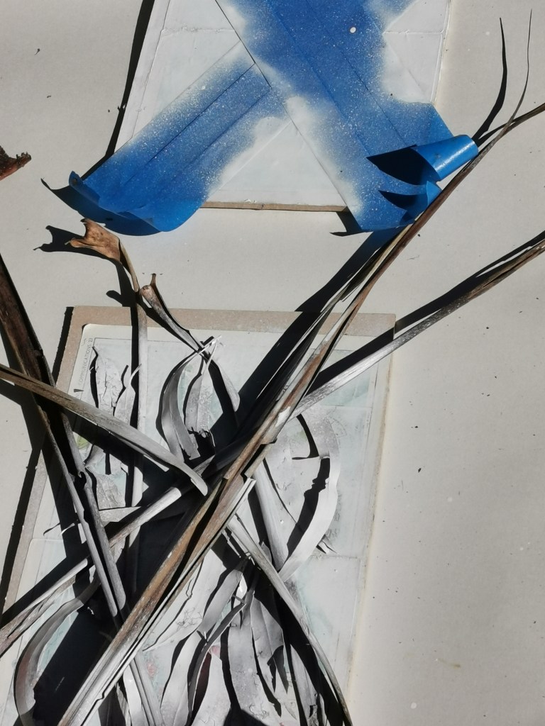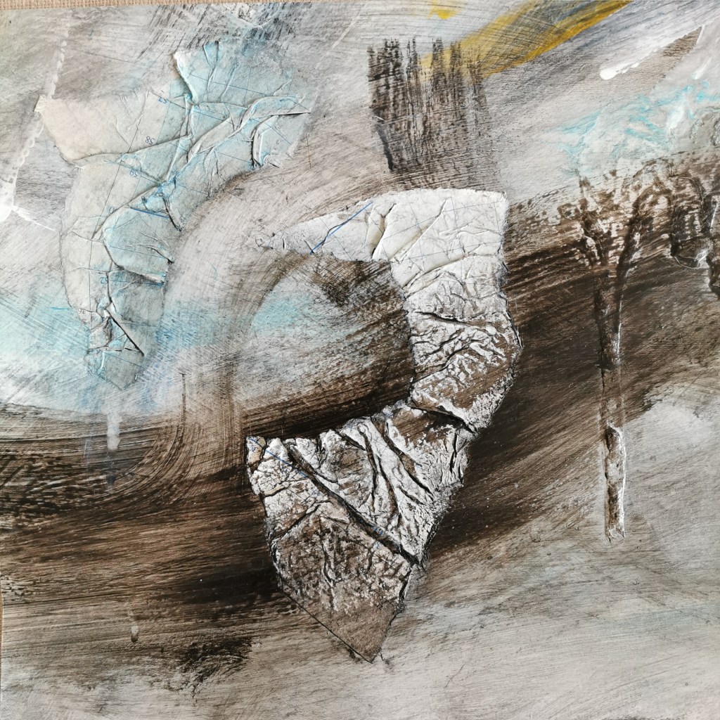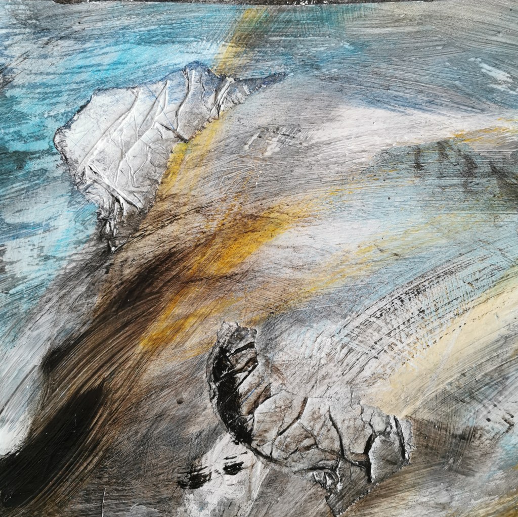 Es wird noch kälter und das Harz lässt sich nicht mehr gut verarbeiten und trocknet nicht richtig. Ich vergesse das Harz und kehre zu meinem Anfang als Künstlerin zurück, zur Collage. Diesmal ist es der Blick auf das Meer, der zum Ausgangspunkt wird. In diesen Himmel und dieses Meer klebe ich ausgerissene Fetzen von Karten, mal mit Falten aufgeworfene Häute, die von den farbigen Flächen mitgerissen werden. Es fühlt sich vertraut an. Reißen, kleben, versenken, aufscheinen lassen. Vielleicht kehre ich Heim.