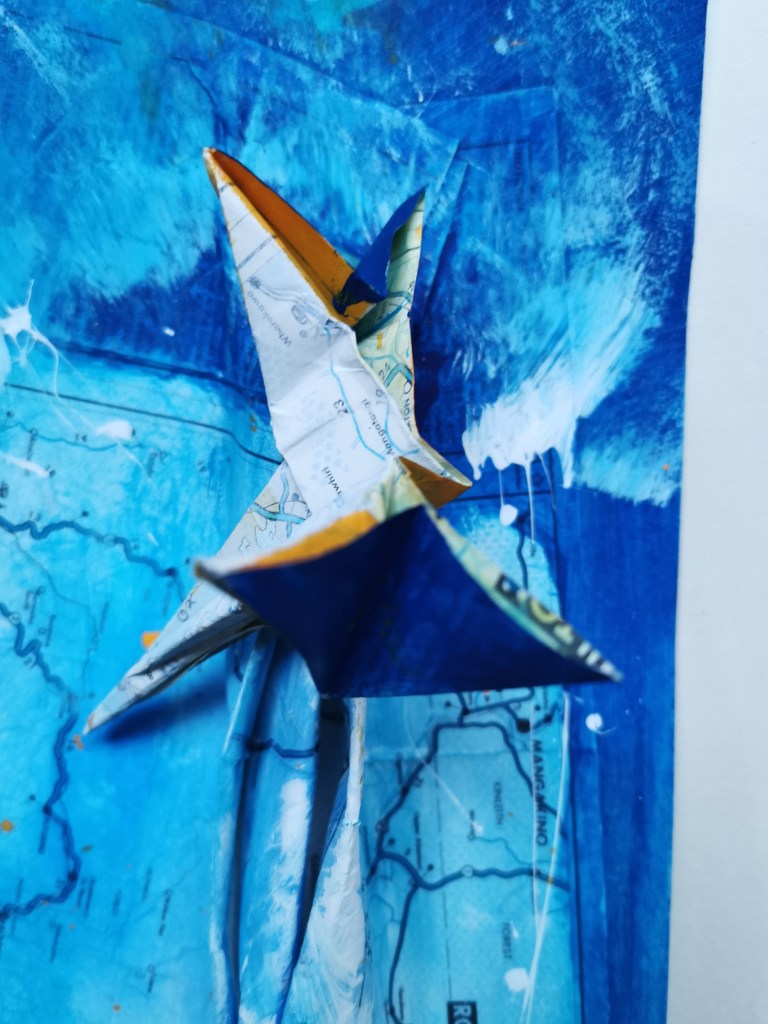 Zu meiner Eingebung gehört auch, auf den Landkarten mit Epoxidharz zu arbeiten. Epoxidharz, das Dinge konserviert. Ich will etwas von diesen Karten bewahren. Etwas von dem, was da gedruckt und festgehalten wurde. Geht es ums bewahren, wenn sich doch alles wandelt? Karten, auf die keiner mehr schaut und die dennoch kostbar sind. In mir will etwas Ausdruck finden, was ich noch nicht benennen kann. Ist es mein Versuch, die Welt, wie sie ist zu feiern, auch wenn Wasserspiegel steigen und Küstenbesiedlungen gefährdet sind? Oder ist es pure Nostalgie? Oder will ich die Menschen um Hingabe an diese weise, berührende Natur anflehen, den allergrößten Schatz überhaupt, den ich gefährdet und kraftvoll spüre?