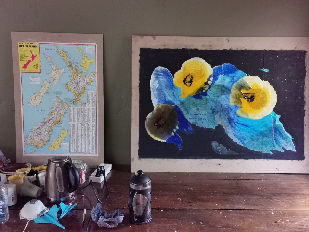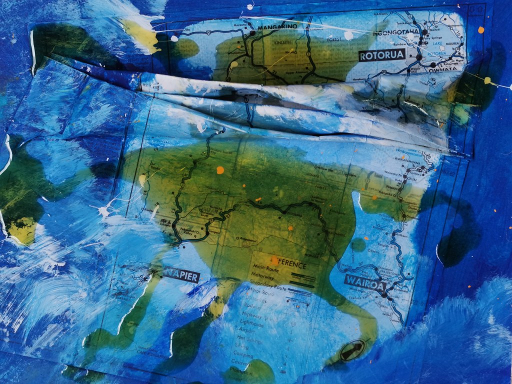 Um mich doch noch etwas auszutoben malerisch, fange ich die Schatten der Flachs- und Farnbüsche im Garten ein. Schönheit. Auf diese Tuschebilder gestalte ich mit Farbe und klebe Teile von Landkarten hinein. Banks Peninsula wird der Kopf eines Wesens mit ausgebreiteten Armen inmitten eines Farndschungels. Beauty und Despair. Dann noch Epoxidharz hinein ins Ringen zwischen von Menschen geschaffenen Werken und Natur. Es wird klebrig. Es ist lebendig.