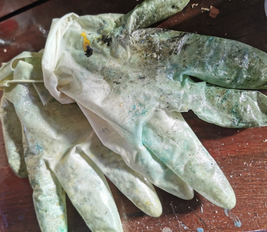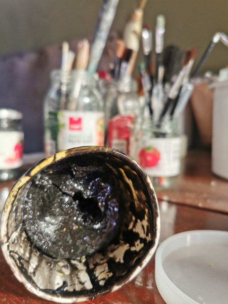 Dave schlägt vor, eine E-Mail in den lokalen Verteiler zu setzen mit meiner Frage nach einem Atelier. Das Leben ist auf meiner Seite, es gibt genau den Ort, wie ich mir keinen besseren hätte erträumen können. Davon habe ich im Blogbeitrag it matters geschrieben. Deshalb kann es hier weiter gehen mit einer Einkaufsliste. Acrylfarben, Tusche, Tinte, Pinsel, Pasten, Pappteller, Pappbecher, Plastikhandschuhe, Cutter, Klebeband und Harz und Holzplatten und Leim, steht auf einer Papiertüte mit Filzschreiber.