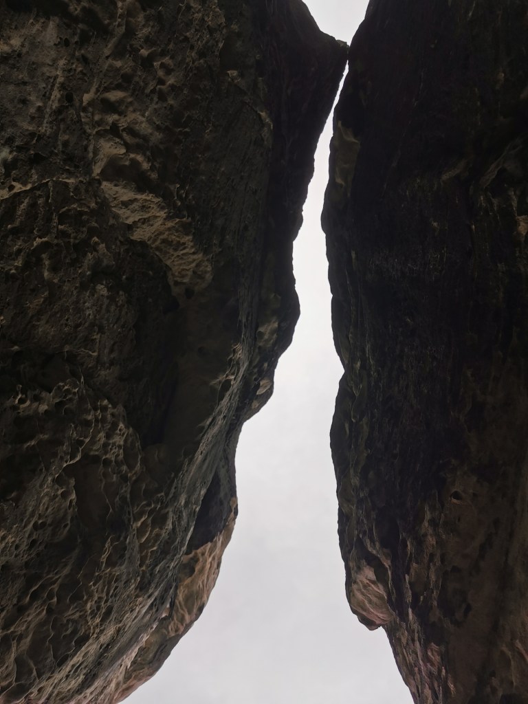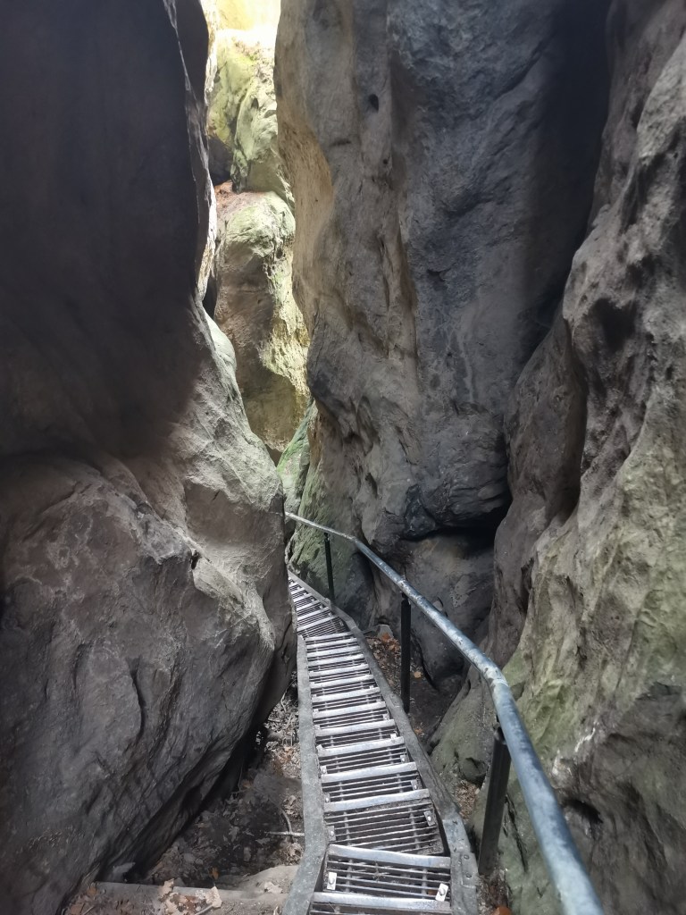 Diese vor Jahrmillionen sich am Meeresgrund gebildeten Sandsteingeschöpfe, mit ihren Krötenmäulern, ihren Häuptlingsnasen, ihren Trollköpfen. Mal hat die Erosion ihnen Ringelröcke angezogen, manch mal muten sie an wie eine oxidierte Bronzefigur, überzogen mit einem Flechtenschleier, dann wieder warmes Ocker, Löcher, die von Vögeln bewohnt werden. Gestalten, die sich neigen, Bögen, die einander gefunden und ein Felsentor geworden, Teufelsschluchten. Und Menschen, die nicht müde sind, stählerne Leitern und Treppen in ihre Leiber zu hauen, um auf ihnen herum zu klettern wie die Liliputaner auf Gulliver. Auf den Schrammsteinköpfen staune ich, dass es keine Befestigung gibt und jeder der wollte, sich senkrecht in die Tiefe stürzen könnte. Ich drehe mich weg, wenn Menschen ihre Schritte Richtung Felskante schieben, atme tief, mein Herz schlägt schnell. Als der Kamm wieder breiter wird, wird es leichter.