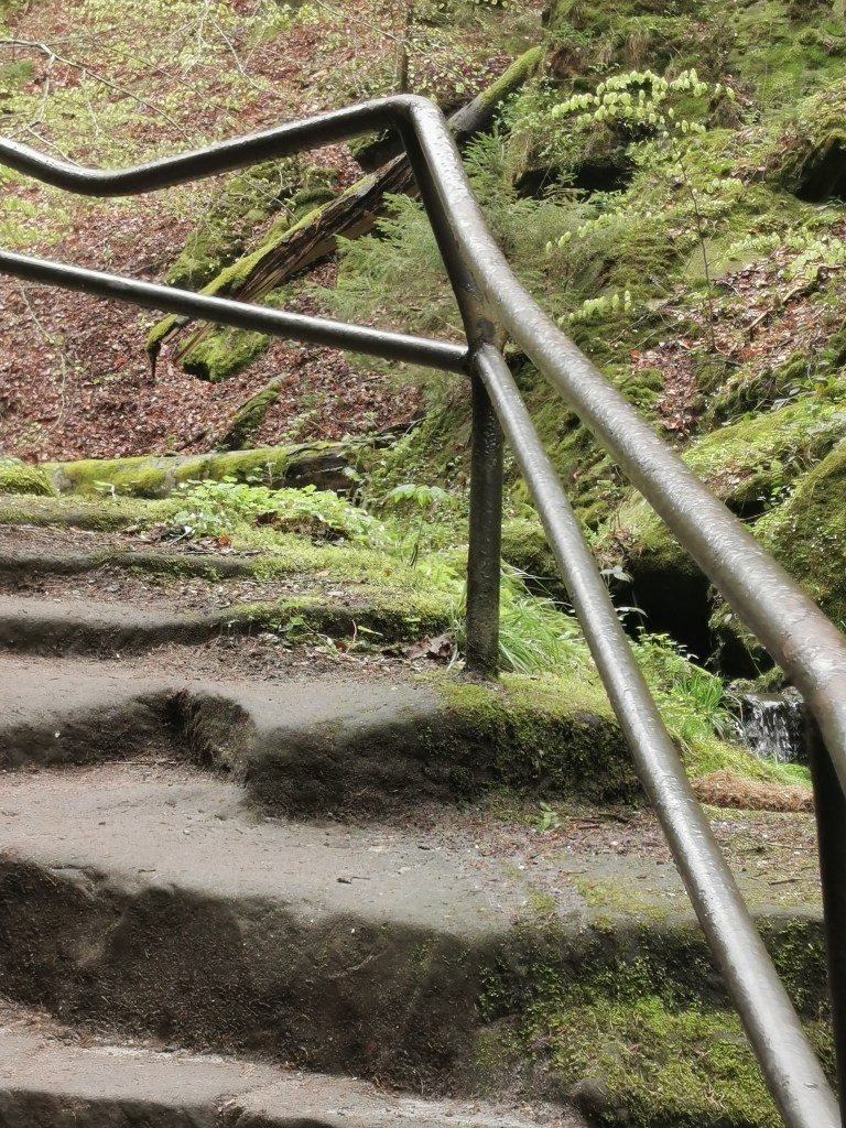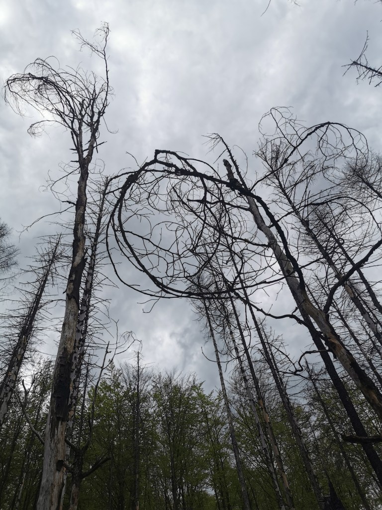 Immer wieder Schlachtfelder von umgestürzten vertrockneten, teils gefällten Fichten, die wie Mahnmale in den Himmel ragen, mit ihren kahlen Ästen, bevor sich die Stämme kreuz und quer über die Hänge verteilen. Krank haben sie Signale gesendet, die die Borkenkäfer verstanden. Sie kamen mit ihren Freunden zum Abschiedsschmaus. Sind sie gestorben, wird Sauerstoff frei, wenn sie verrotten dürfen. So entsteht fruchtbarer Boden für Tiere und Pflanzen. Auf den Tafeln des Hohensteiner Naturlehrpfades lese ich, dass sich die Mischwälder wieder ihren Lebensraum nehmen, wenn wir sie nur lassen. Hier sieht es ganz danach aus.