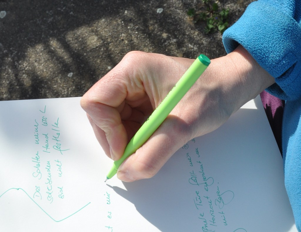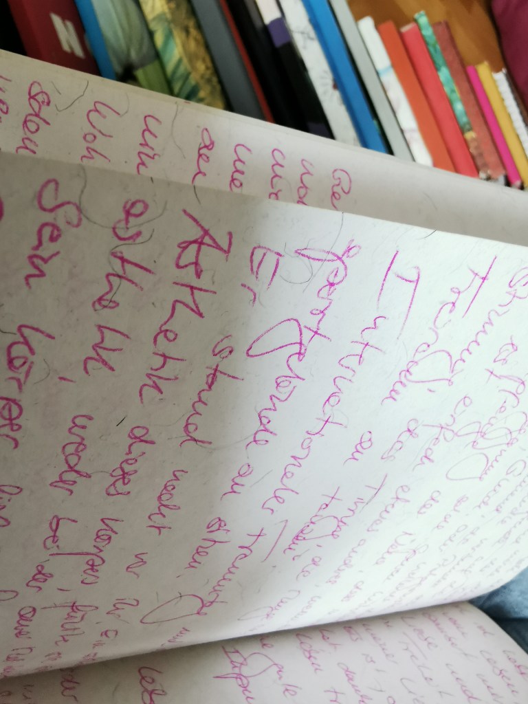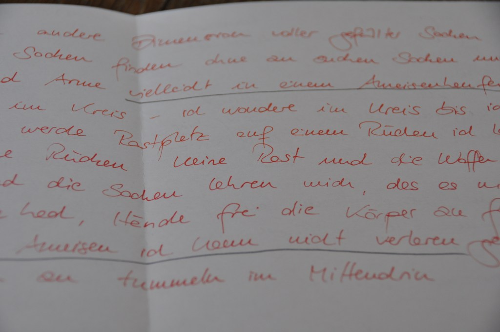 schreiben und die Katze schnurren lassen, écriture automatique, nicht mehr absetzen, nicht mehr anhalten, nicht mehr denken, nicht mehr und weiter und die Ameisen laufen in Straßen über den Waldboden über mein Bein über die Hügel und ich höre nicht mehr auf und nicht mehr auf und kritzel und kratzel und und und