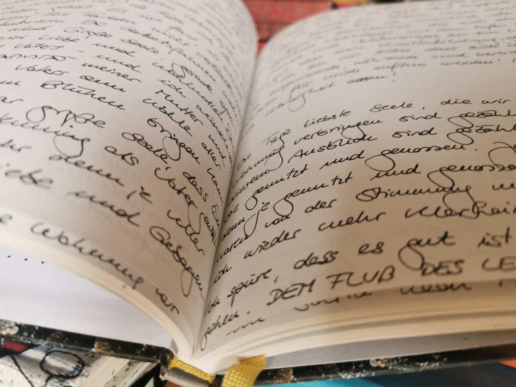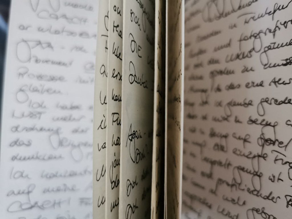 Das Kind hat im Tagebuch mit Gott gesprochen. Es ist auch ein heiliger Ort, ein Ort, an dem sie sich diesen leeren Seiten anvertraut. Unliniert. Über beide Seiten schreibt. Winzig und groß.